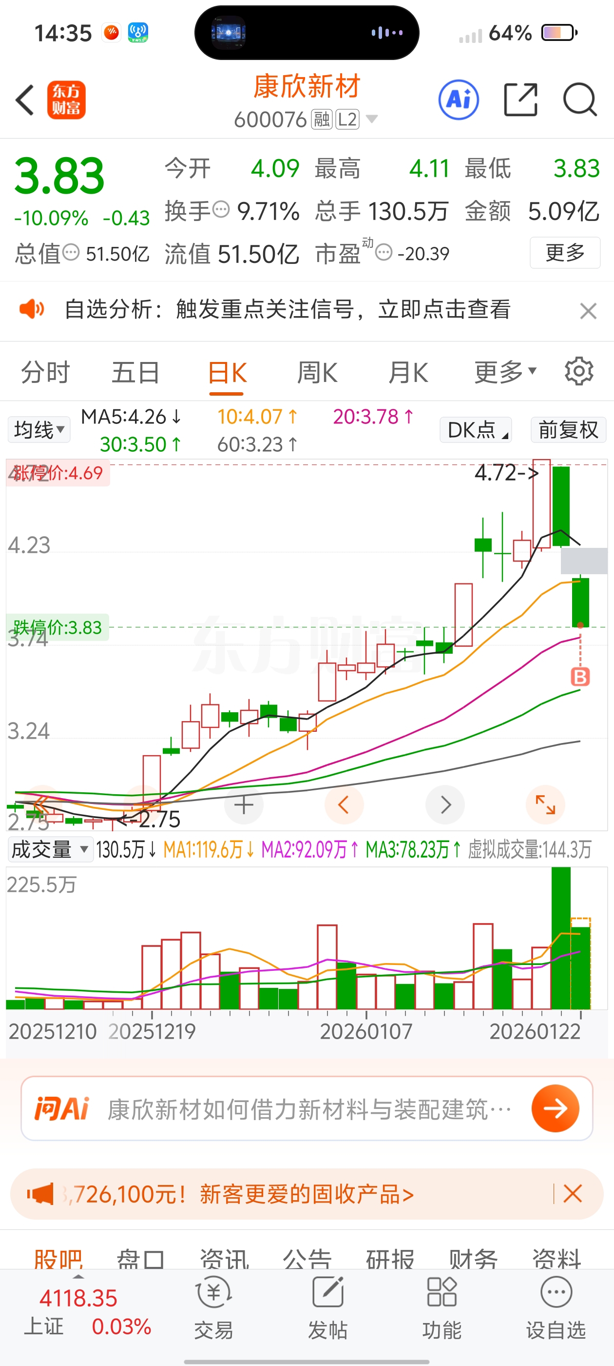 $康欣新材(SH600076)$ 建材最近走的挺好的,慢慢低吸,趋势不破,慢慢加