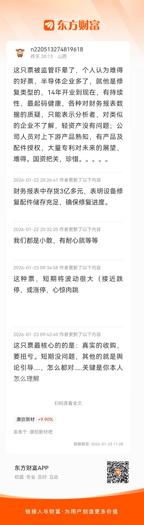温馨提示: 1.根据《证券法》规定,禁止编造、传播虚假信息或者误导性信息,扰乱证券市场;2.用户在本社区发表的所有资料、言论等仅代表个人观点,与本网站立场无关,不对您构成任何投资建议。用户应基于自己的独立判断,自行决定证券投资并承担相应风险。《东方财富社区管理规定》