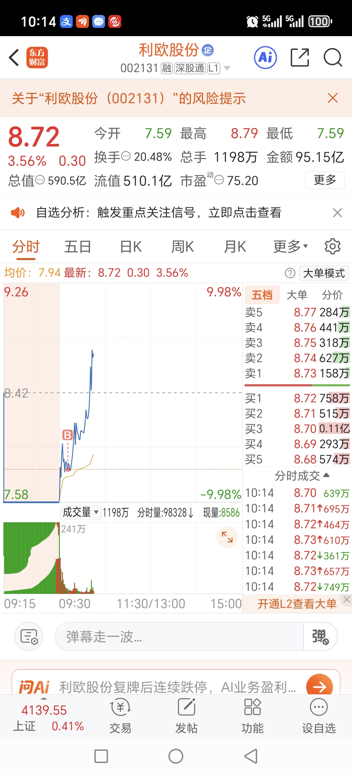 $康欣新材(SH600076)$ 康欣新材,昨天早上抄底的 ,昨天在跌停附近徘徊 ,今天早上就涨停,这种低位的才有性价比, 通知过五个老铁只有三个买了,早上我直接卖飞了康欣 ,为了抄利欧股份,选择利欧,因为利欧今天空间更大,只有提前预判,拒绝马后炮