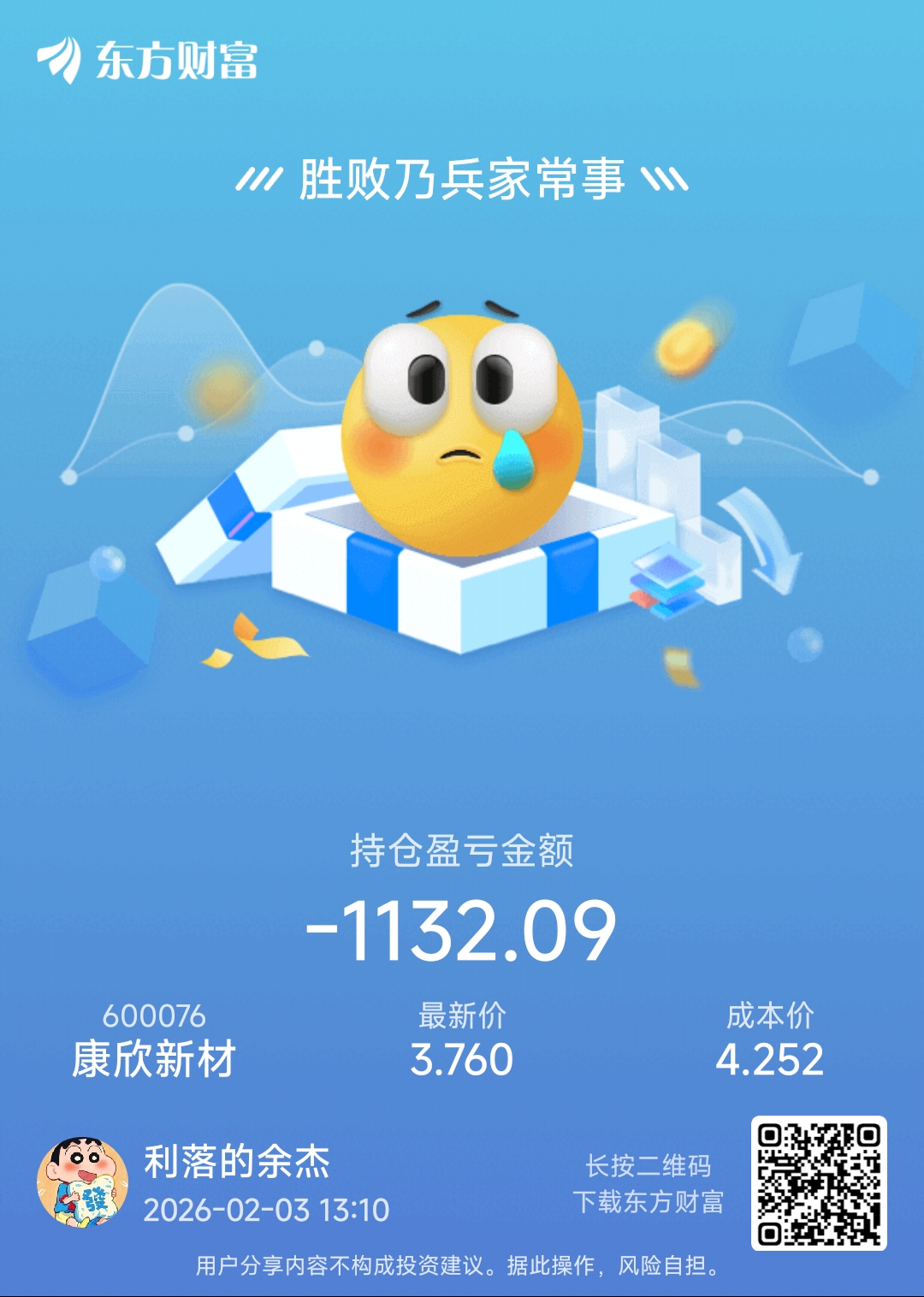 温馨提示: 1.根据《证券法》规定,禁止编造、传播虚假信息或者误导性信息,扰乱证券市场;2.用户在本社区发表的所有资料、言论等仅代表个人观点,与本网站立场无关,不对您构成任何投资建议。用户应基于自己的独立判断,自行决定证券投资并承担相应风险。《东方财富社区管理规定》