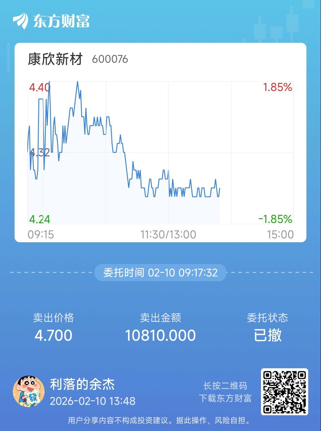 温馨提示: 1.根据《证券法》规定,禁止编造、传播虚假信息或者误导性信息,扰乱证券市场;2.用户在本社区发表的所有资料、言论等仅代表个人观点,与本网站立场无关,不对您构成任何投资建议。用户应基于自己的独立判断,自行决定证券投资并承担相应风险。《东方财富社区管理规定》