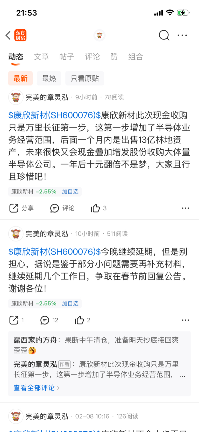 $康欣新材(SH600076)$ 今天中午提醒大家延期了,给了大家一个下午时间减仓,今晚我再次提醒大家,明天不是卖康欣新材的时候,聪明人明天应该买入康欣新材,康欣新材一年内上10元,此次现金收购半导体公司是万里长征第一步,今年康欣新材还会重大资产重组收购,信的有缘人且行且珍惜吧!