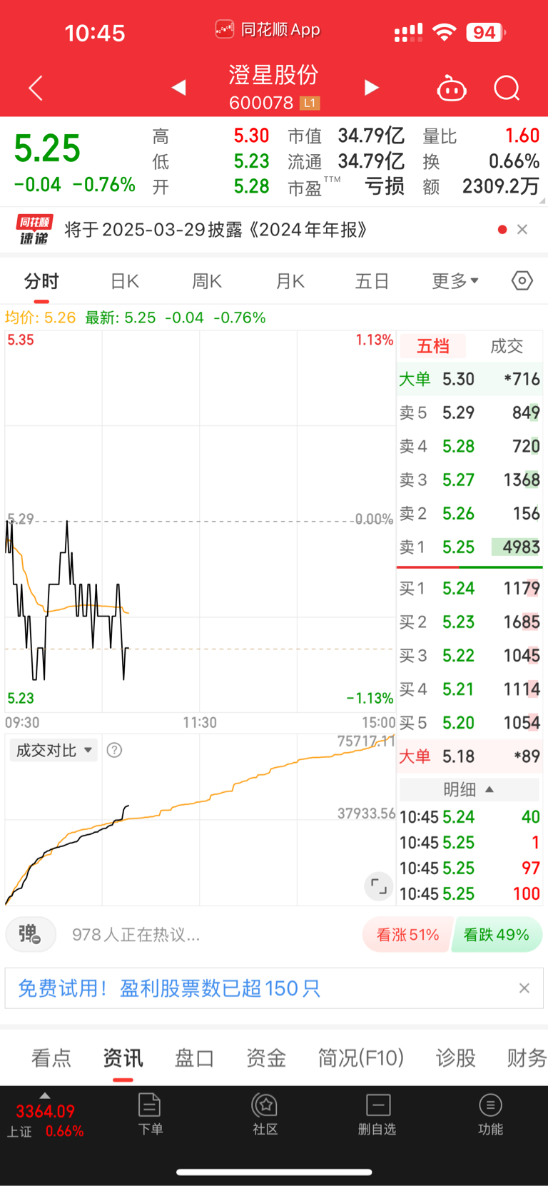 $澄星股份(SH600078)$ 炒股七八年第一次遇到这种情况,有没有大神分析一下主力的想法是什么,你要是想跑就痛痛快快的砸。每天都是这种挂单,让人摸不清头脑。