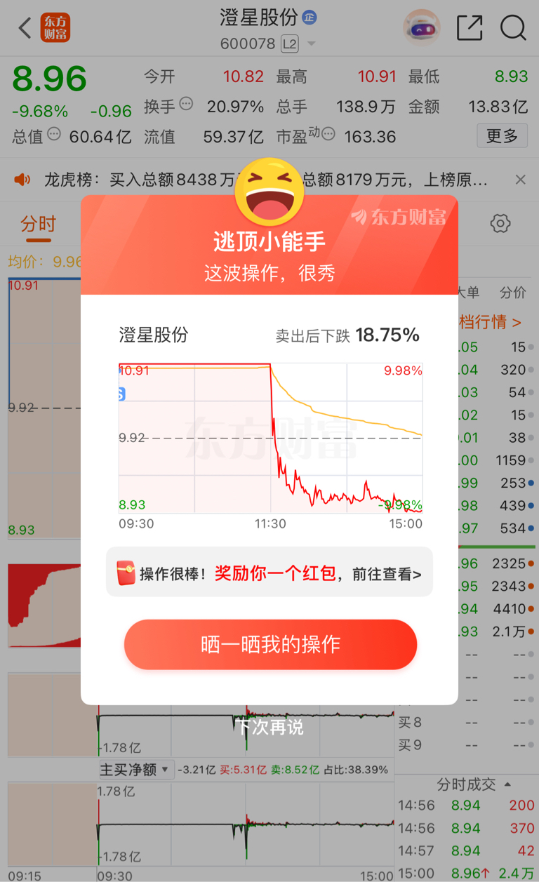 $澄星股份(SH600078)$ 早上想做个T,结果被洗出去了。收盘一看,惊出一身冷汗