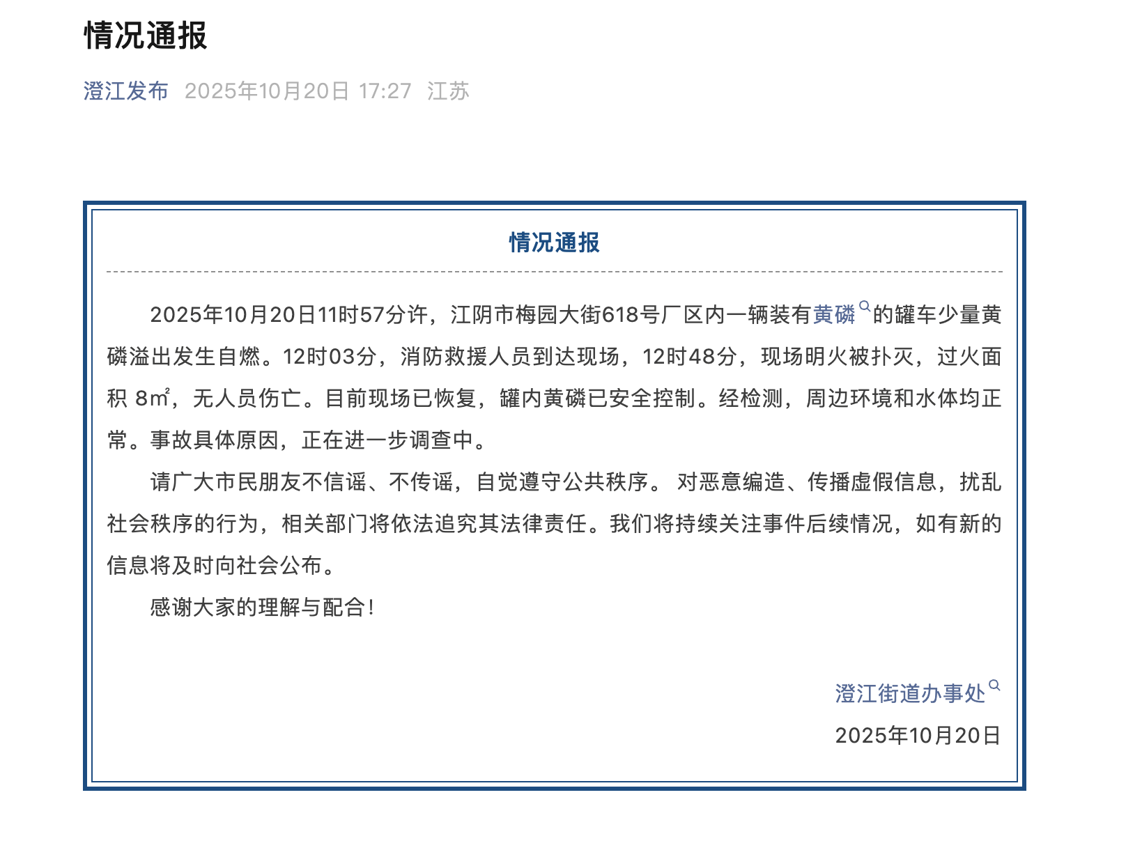 10月20日17时30分左右,澄江街道办事处发布情况通报:10月20日11时57分许,江阴市梅园大街618号厂区内一辆装有黄磷的罐车有少量黄磷溢出发生自燃。12时03分,消防救援人员到达现场,12时48分,现场明火被扑灭,过火面积8m²,无人员伤亡。目前现场已恢复,罐内黄磷已安全控制。经检测,周边环境和水体均正常。