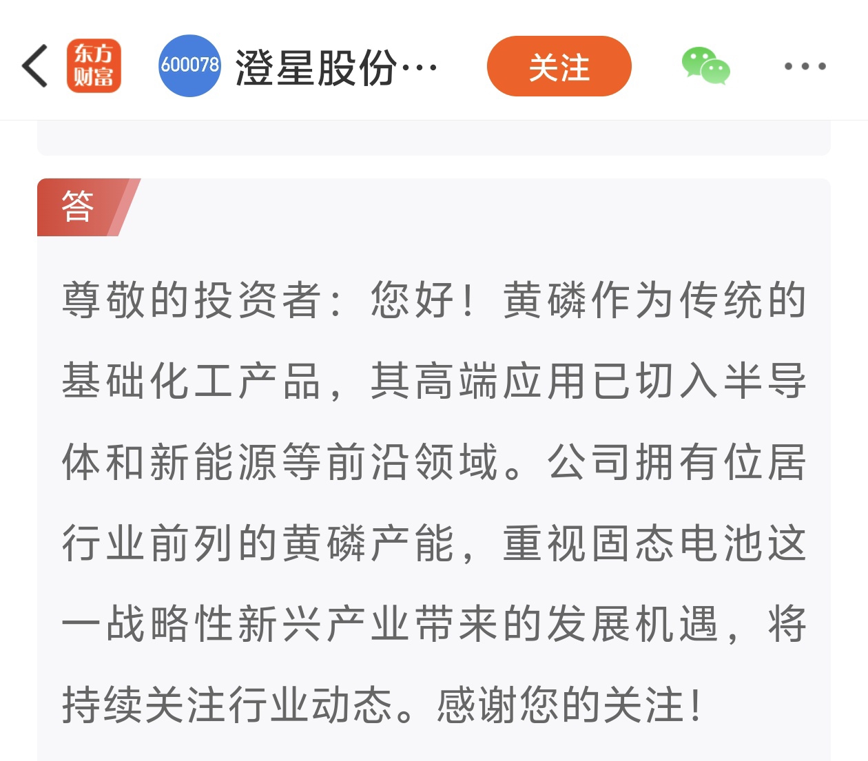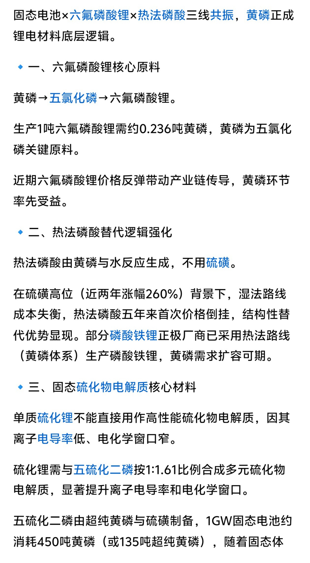 $澄星股份(SH600078)$ 量化遛狗的疯狂电风扇行情从周期品向科技材料转型(资源“硬通货”从到新材料“高科技”)五硫化二磷由超纯黄磷与硫磺制备,1GW固态电池约消耗450吨黄磷(或135吨超纯黄磷),随着固态体系放量,电子级黄磷需求将快速上升。