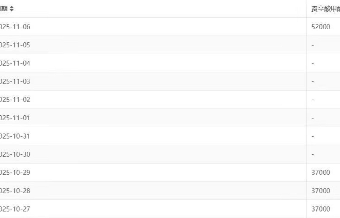 贲亭酸甲酯今日从3.7万跳涨至5.2万,单日涨40%,长青股份产能4000吨国内
