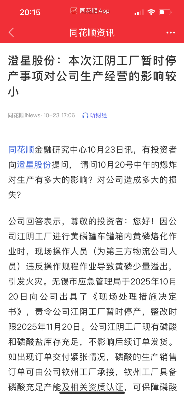 $澄星股份(SH600078)$ 20发生的事,23号公司就回应过影响小了,你们在激动啥??