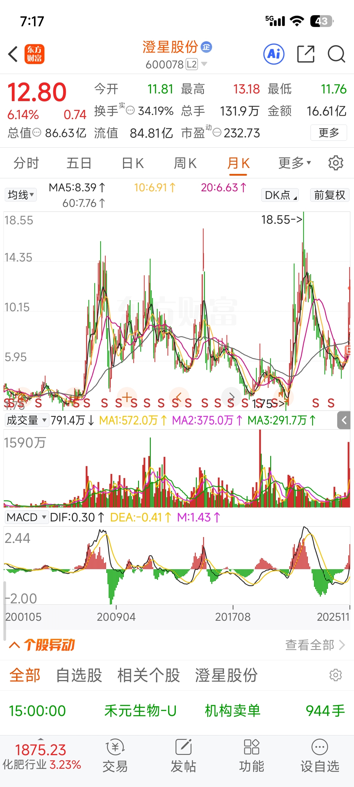 $澄星股份(SH600078)$ 看月线又来到了多年前的套牢密集区,能突上去就是前途无量。