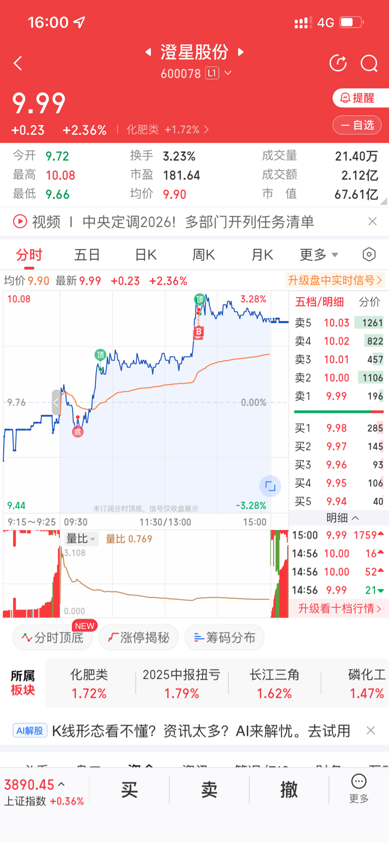 $澄星股份(SH600078)$ 今天买在了次高点,不会下周又又套我吧