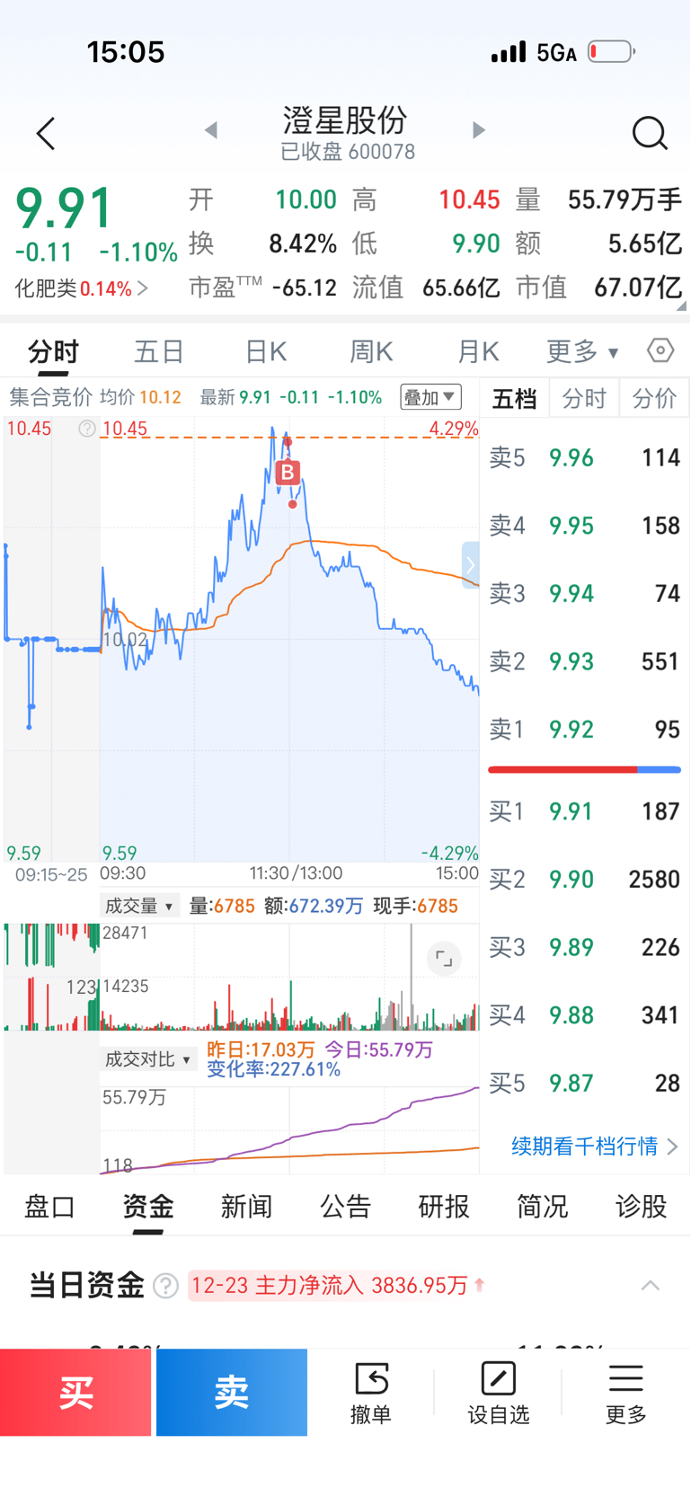 $澄星股份(SH600078)$ 对不起各位老板呢,本来想拉个涨停的,奈何对手盘不同意,说年底要用钱了,熬不住了。我也实在有心无力呀。