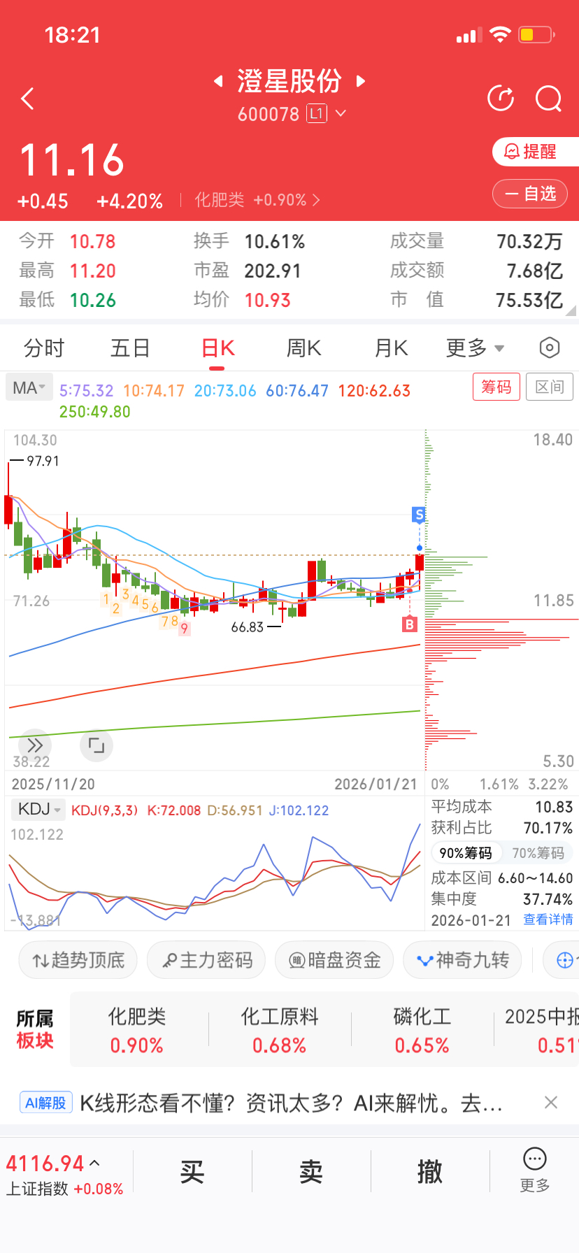 $澄星股份(SH600078)$ 昨天收盘前10.7买的,今天收盘前11.1卖了,马马虎虎吧。