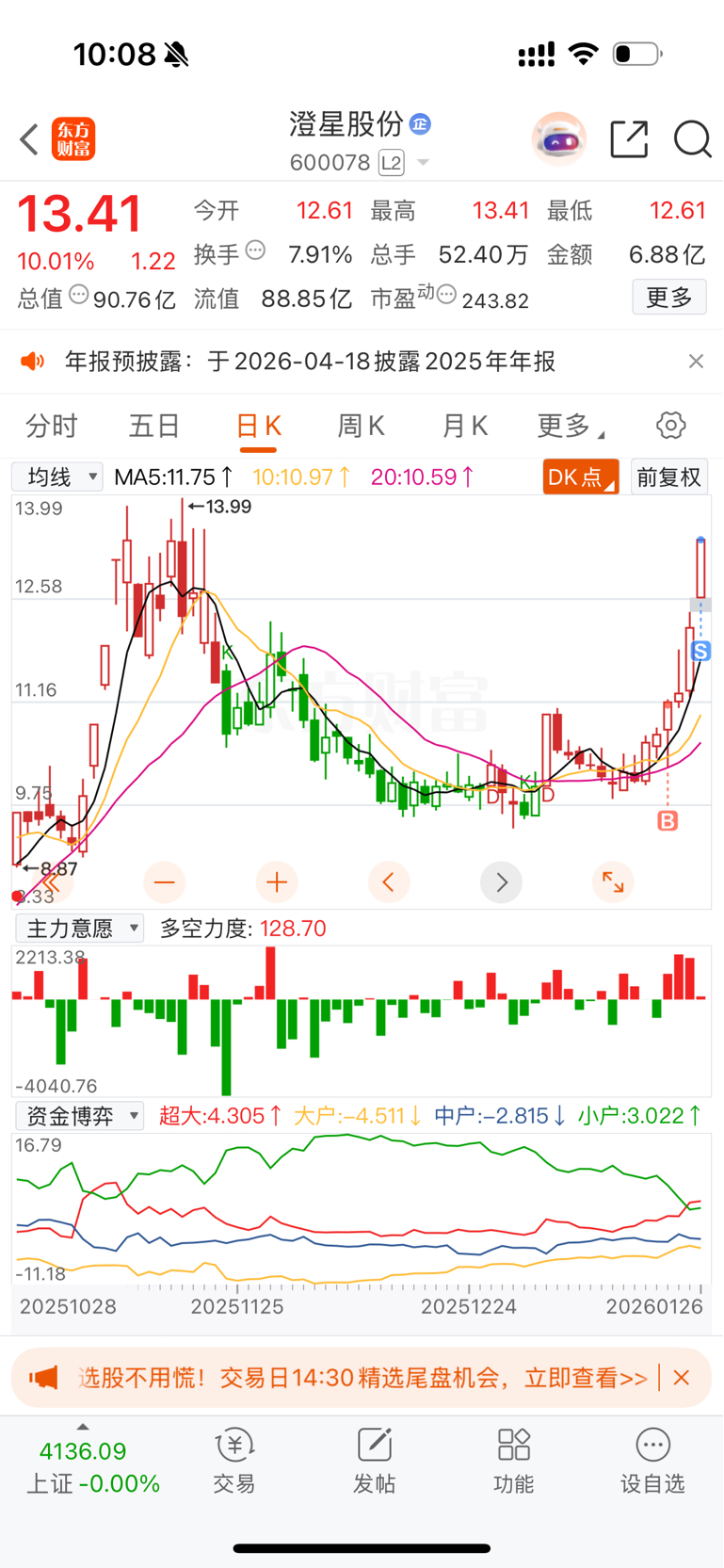 $澄星股份(SH600078)$ 11.1进的,一周赚两块走了,留下的发财