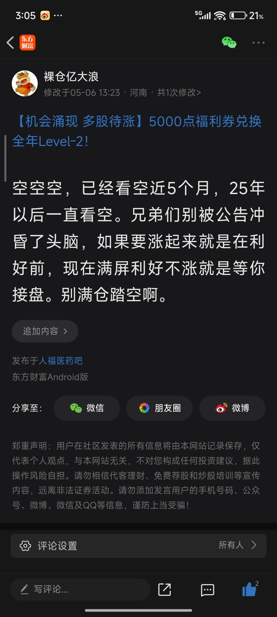 温馨提示: 1.根据《证券法》规定,禁止编造、传播虚假信息或者误导性信息,扰乱证券市场;2.用户在本社区发表的所有资料、言论等仅代表个人观点,与本网站立场无关,不对您构成任何投资建议。用户应基于自己的独立判断,自行决定证券投资并承担相应风险。《东方财富社区管理规定》