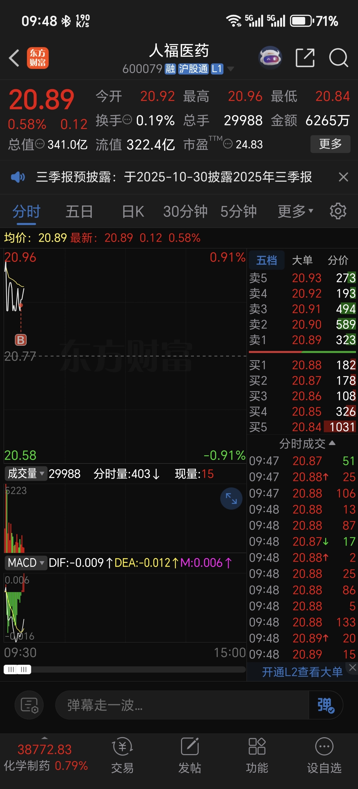 $人福医药(SH600079)$ 今日放量上涨,后面几天能回点血了