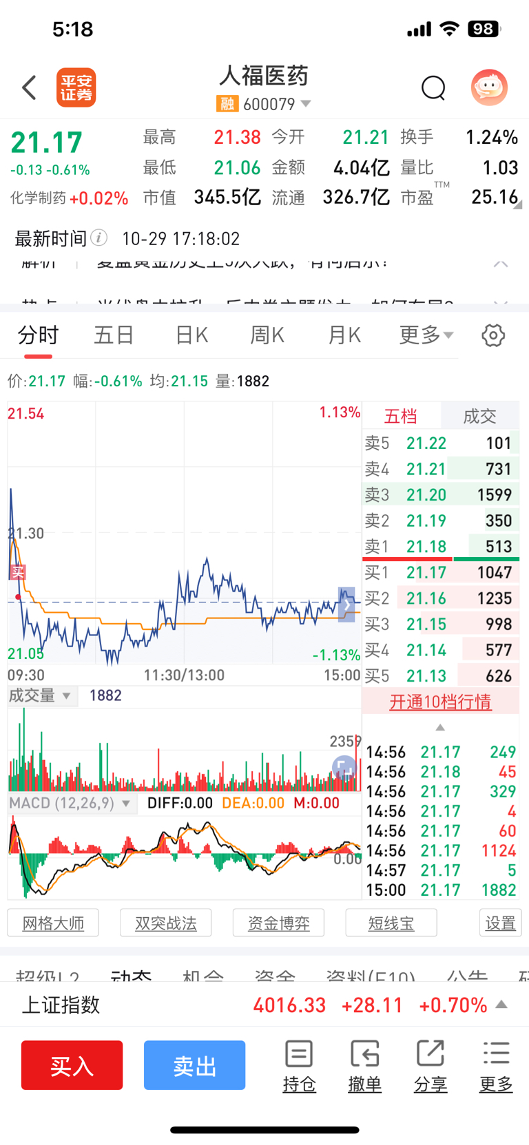 $人福医药(SH600079)$ 昨晚挂了21.18买单,没想到醒来跌到21.09,全天没有t出去的机会,只能等明天了,如果明天再深跌就继续买