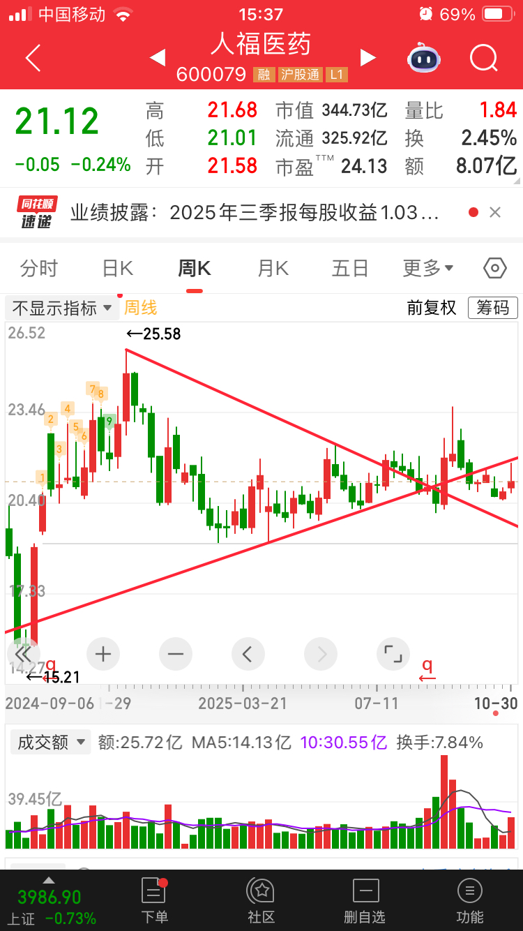 $人福医药(SH600079)$ 小福子 给我突破吧 不突破 随着大盘调整 小福子 继续给我调整4周