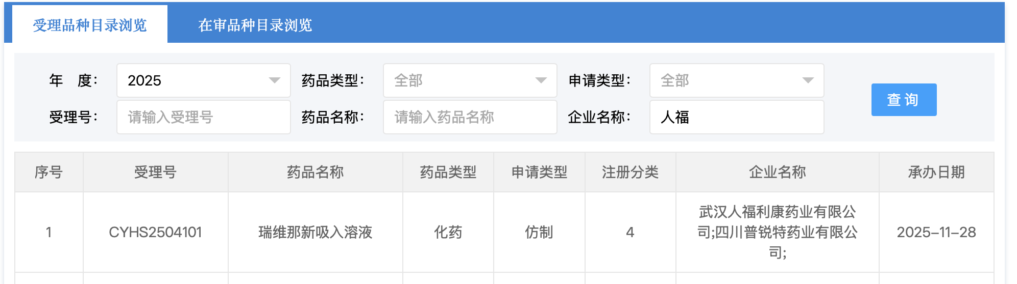 11月28日 人福医药 瑞维那新吸入溶液仿制药 申请受理.