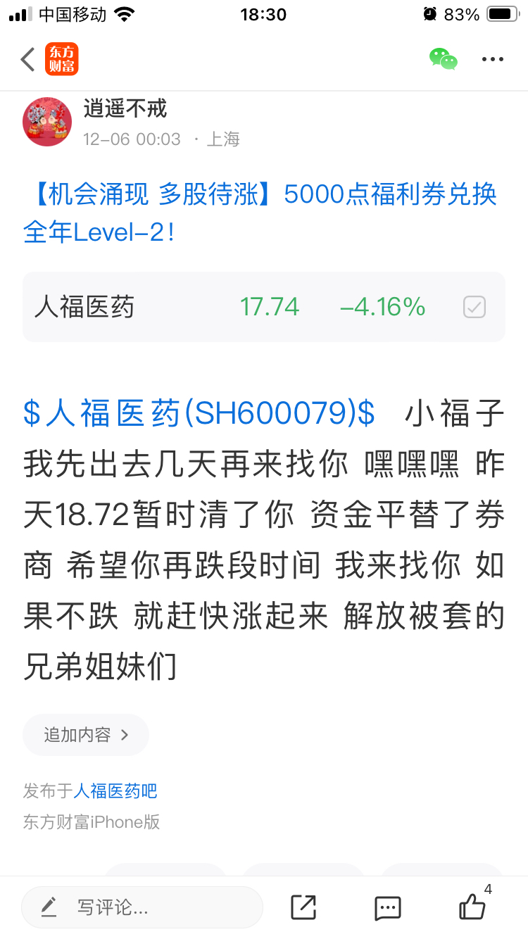 $人福医药(SH600079)$ 小福子 还好前几天 没看错你 你就这德行 还好 平换券商都回来了 你太差劲了 等你跌透 我再来 耗你羊毛 你这主力是 一毛不拔 金刚毛