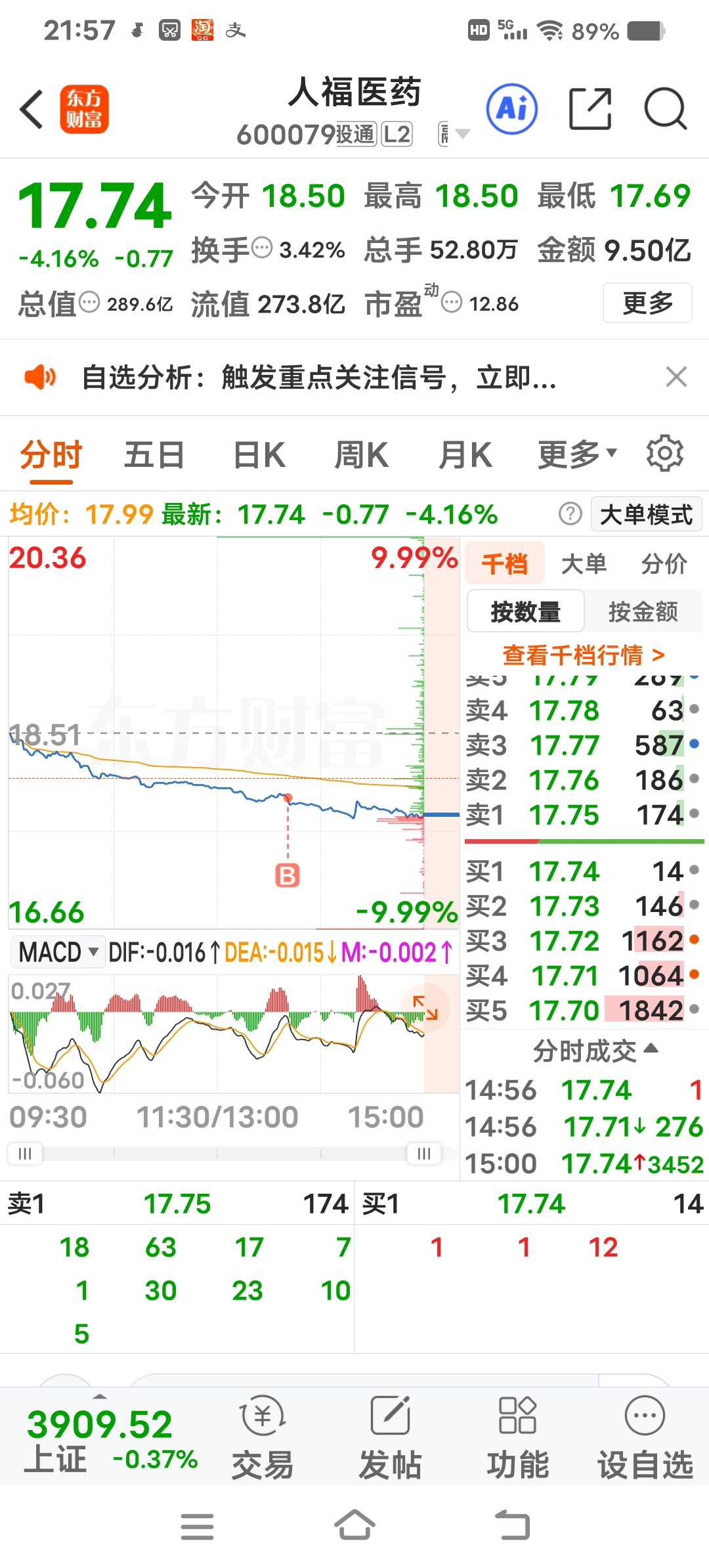 $人福医药(SH600079)$ 挂单17.90以为低点了,不会是半山腰吧?
