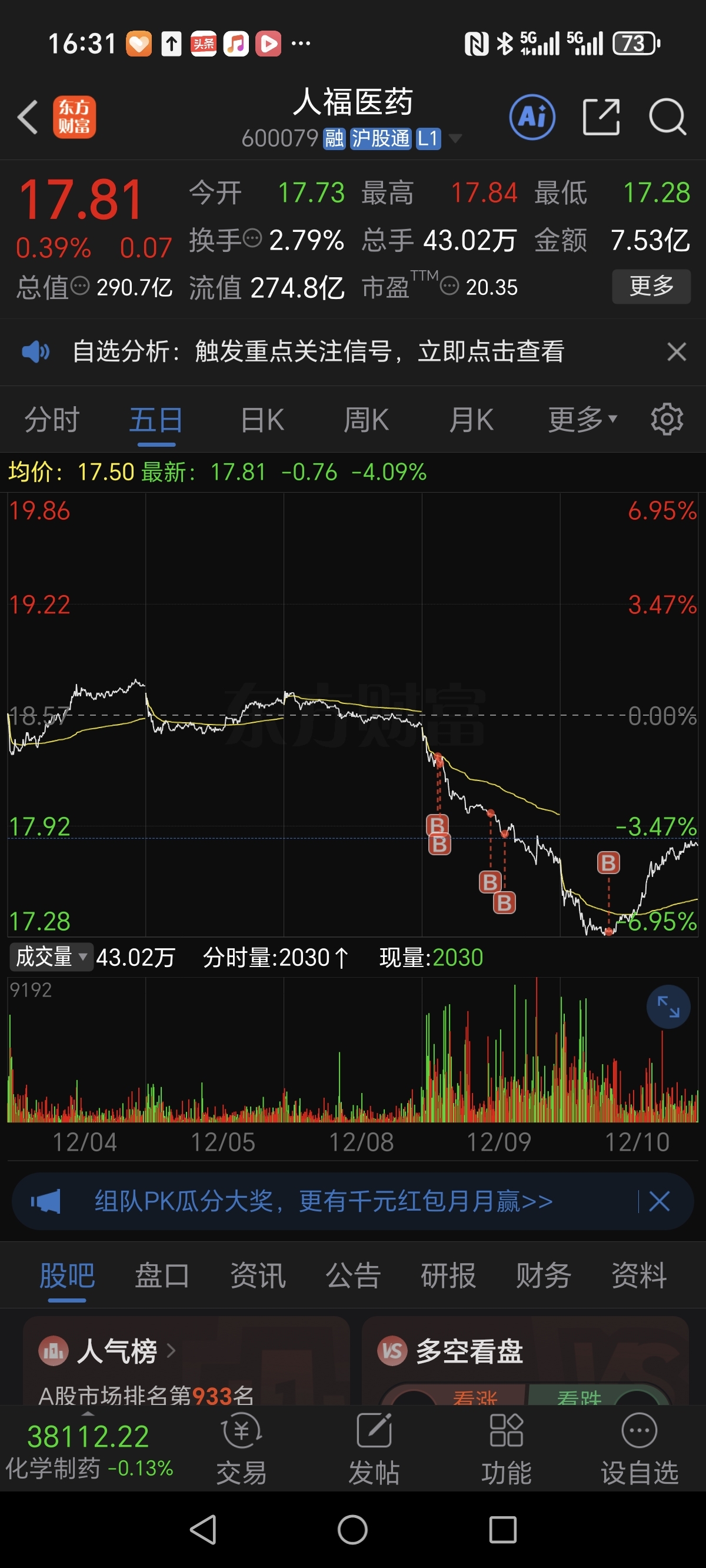$人福医药(SH600079)$ 我不相信你连智飞生物都不如,智飞市净率也要1.6.而你只有1.5死磕到底