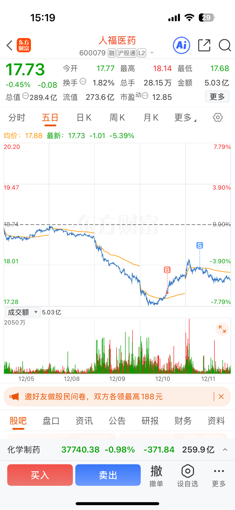 $人福医药(SH600079)$ 还是难堪大用赚两个多点走了
