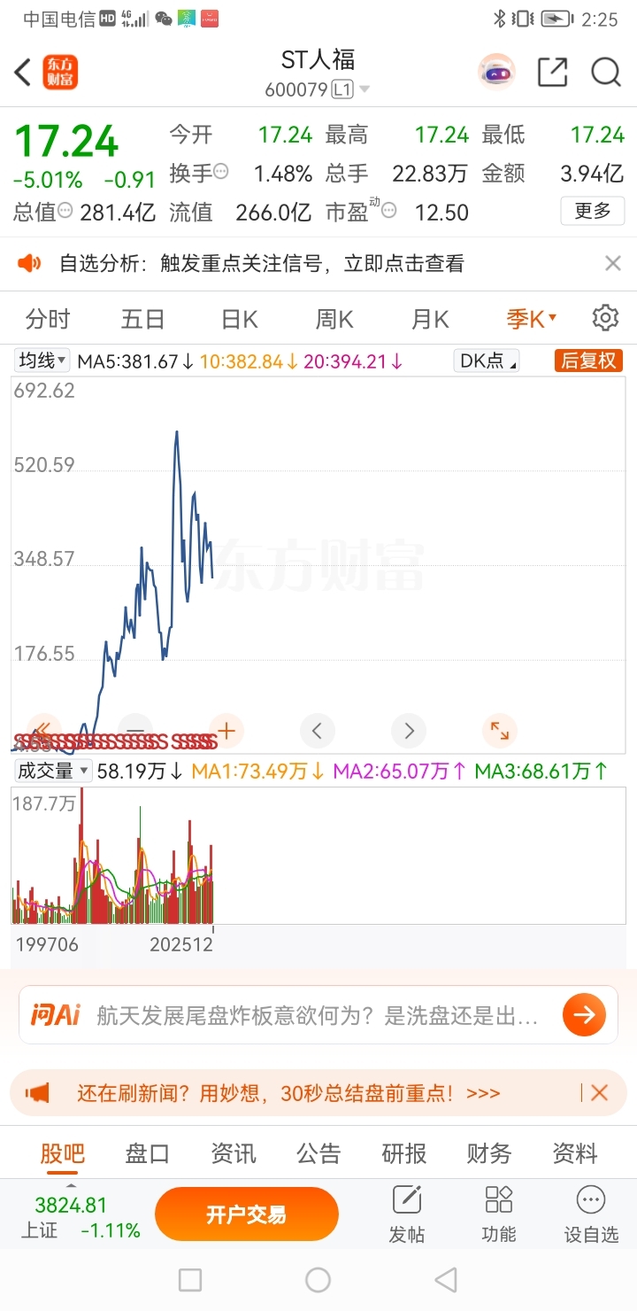 $ST人福(SH600079)$ 复权价325远远未跌到胃,ST到10元以下再说吧