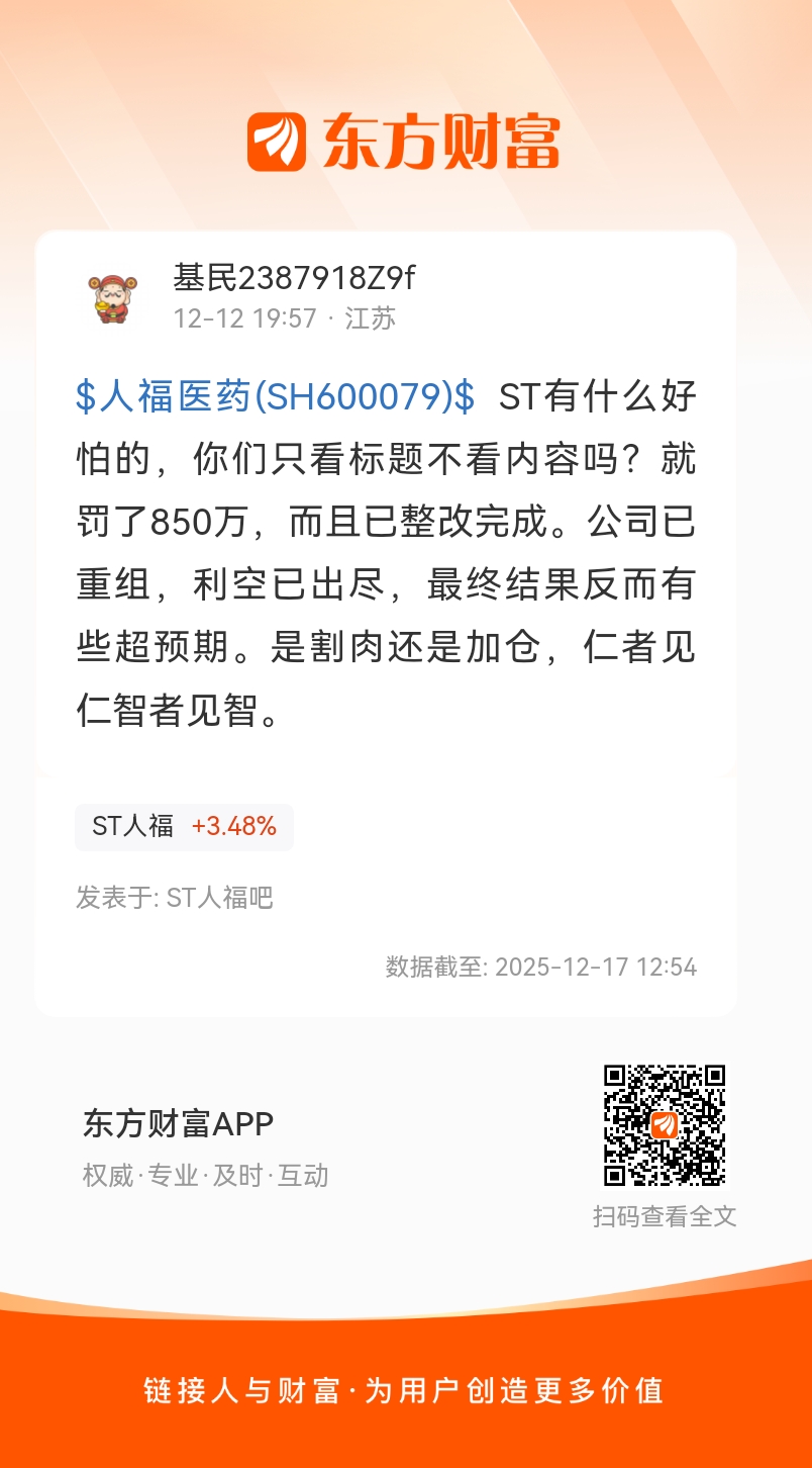$人福医药(SH600079)$ ST有什么好怕的,你们只看标题不看内容吗?就罚了850万,而且已整改完成。公司已重组,利空已出尽,最终结果反而有些超预期。是割肉还是加仓,仁者见仁智者见智。