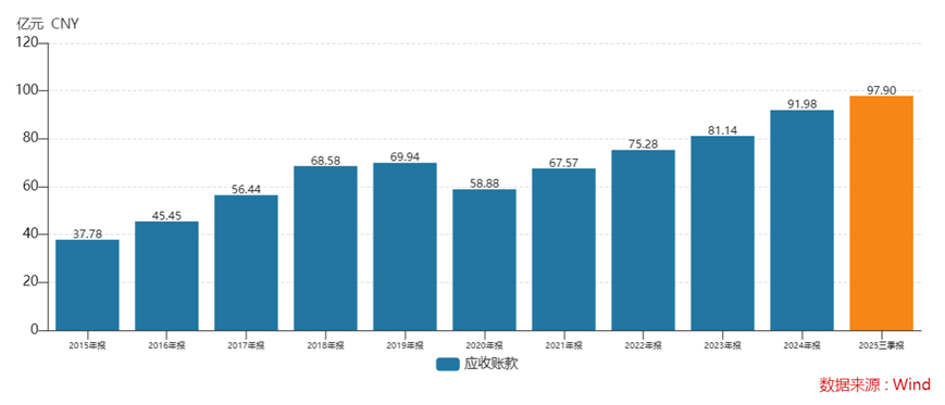 另一个值得关注的财务风险点是规模庞大的应收账款。截至2025年第三季度,公司应收账款余额已达到97.90亿元的历史高位。