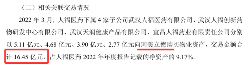 除了资金占用问题,人福医药还因为关联交易信息披露不当,导致2022年年度报告存在重大遗漏。2022年3月,人福医药下属四家子公司分别向武汉珂美立德生物医药有限公司购买物业资产,交易金额合计16.45亿元。珂美立德与人福医药的关系复杂而微妙,该公司由人福医药于2014年7月设立,2019年被出售。工商信息显示,其控股股东武汉当璟与“当代系”存在诸多关联。