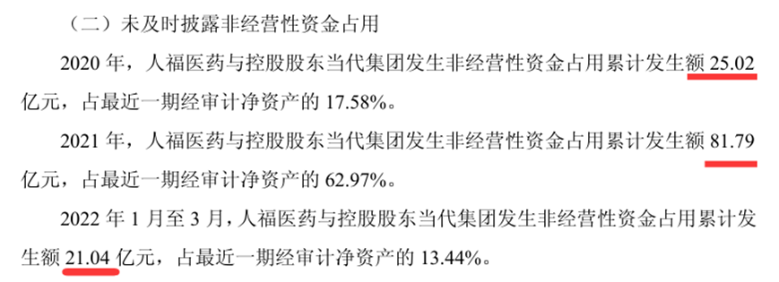 翻开证监会的处罚文件可以发现,人福医药在2020年至2022年3月间,与控股股东当代集团发生非经营性资金占用累计发生额高达127.85亿元。其中,2020年累计发生额25.02亿元,占当时经审计净资产的17.58%;2021年累计发生额81.79亿元,占净资产比例上升至62.97%;2022年1月至3月,发生额仍达21.04亿元,占比为13.44%。