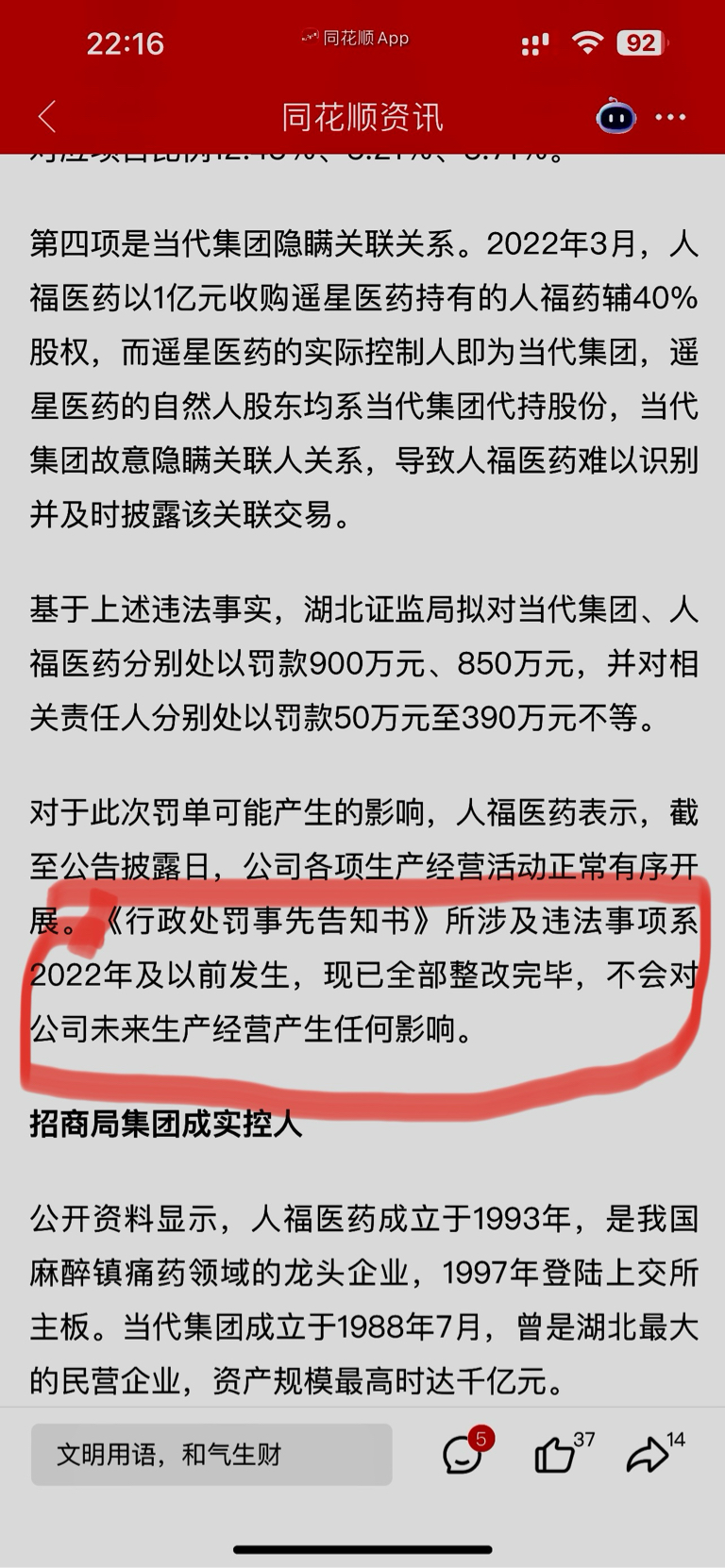 $ST人福(SH600079)$ 标题党的咨询,为什么重要的不说?人家列举了4项违规,也标注了均整改完成,你只说负面的东西,是不是砸到深水你好拿低价筹码?
