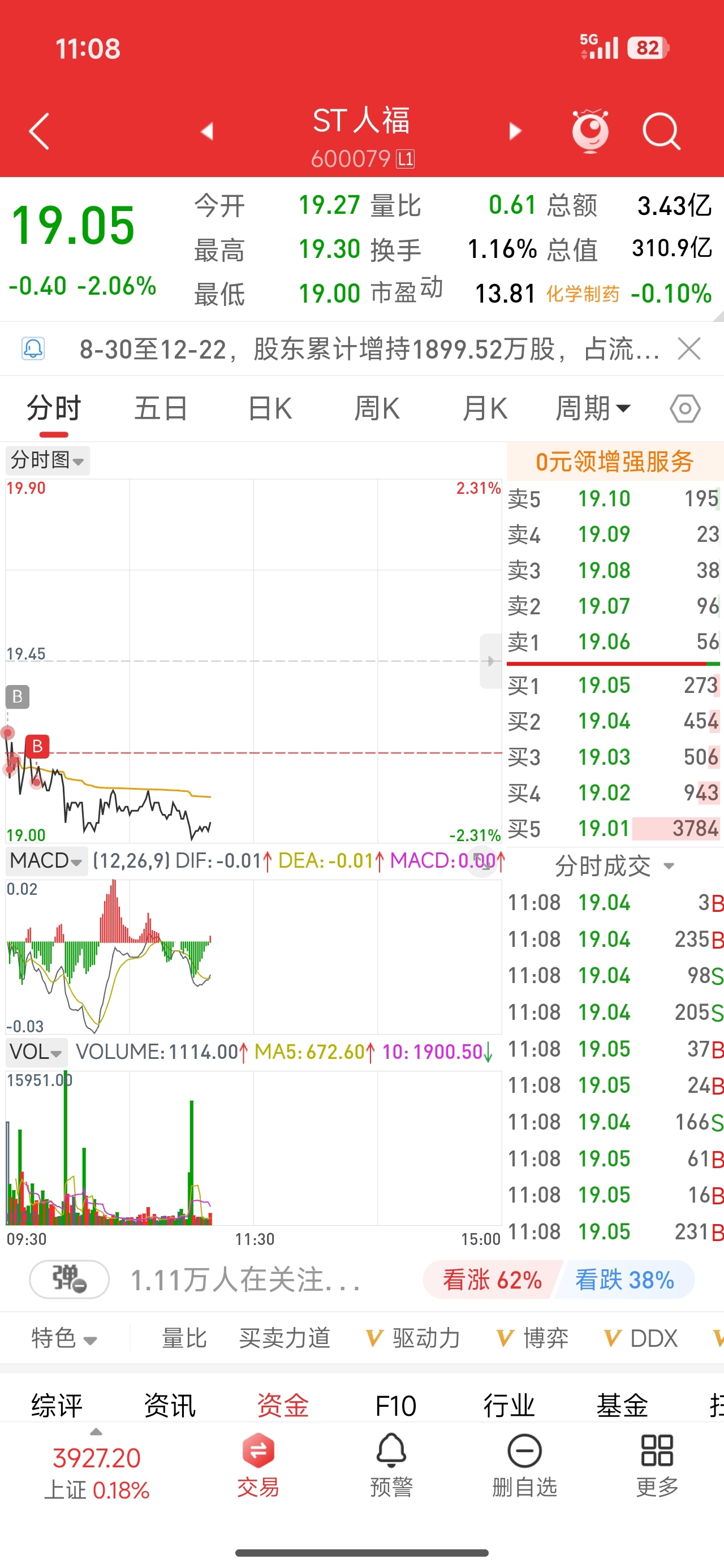 $ST人福(SH600079)$ 今天才进场,想跌就跌吧,明天继续买,招商局进场,优质st股,很难得的机会,等到你摘帽子