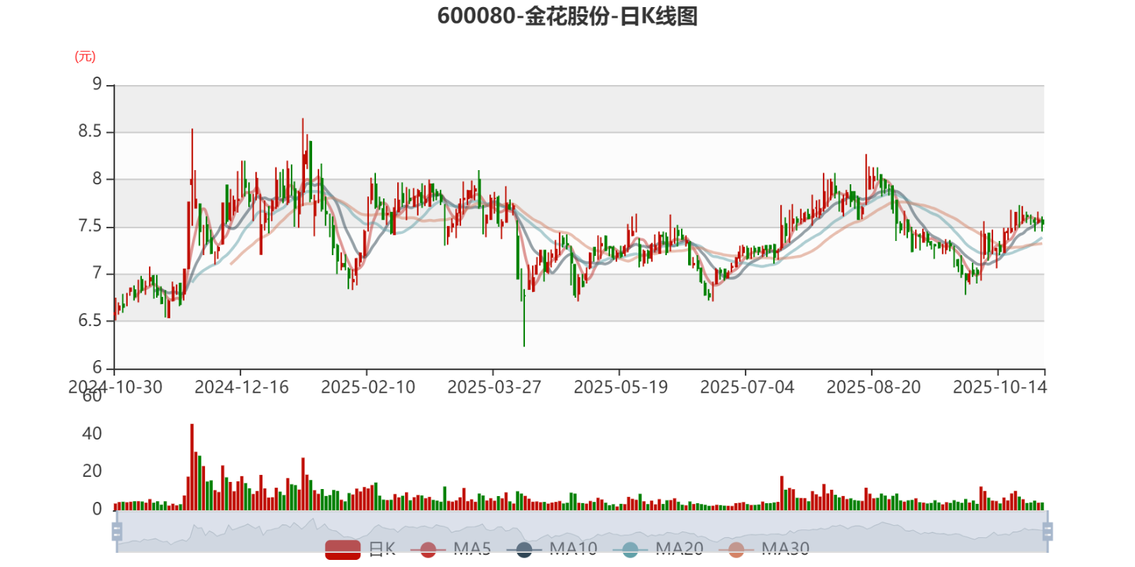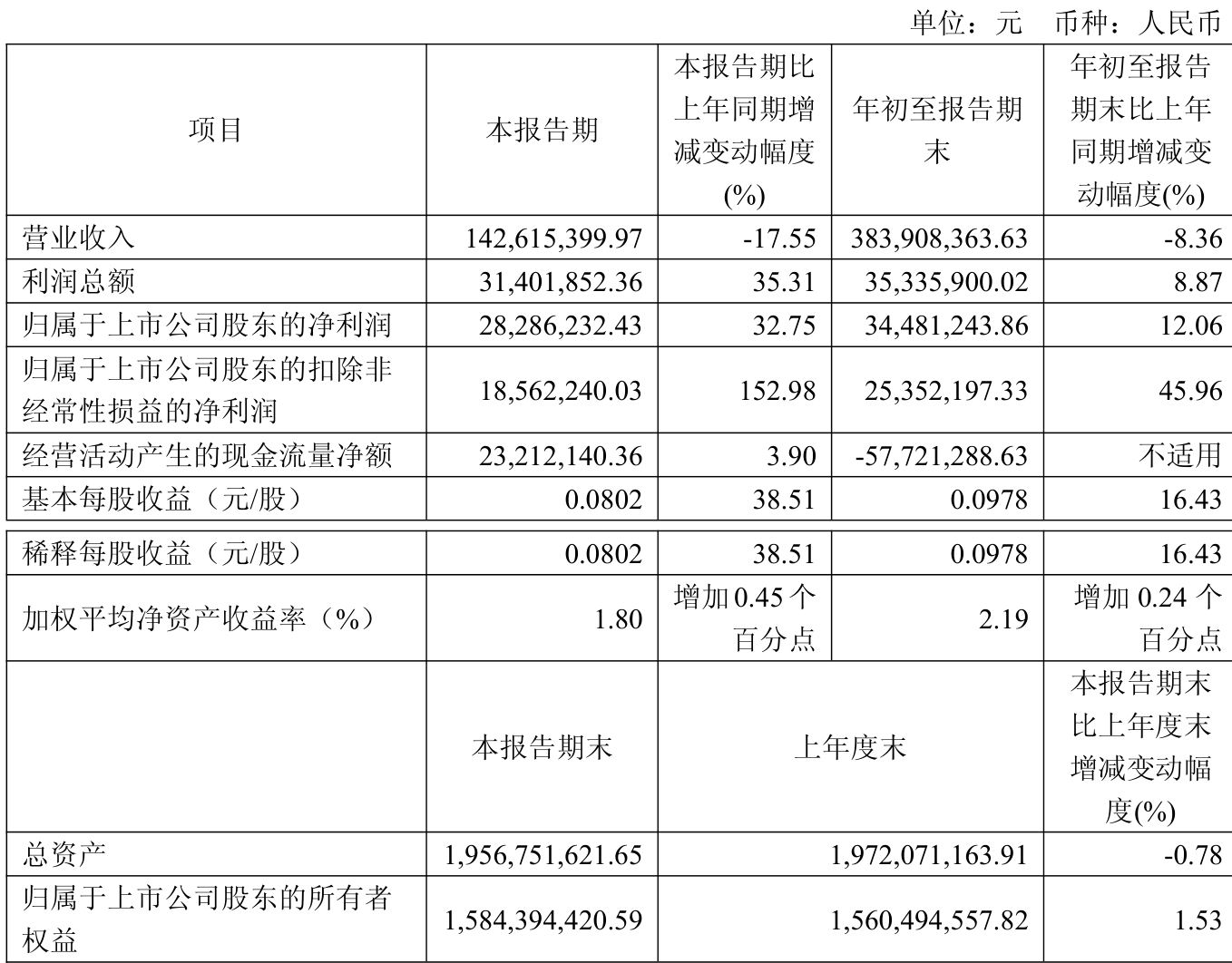 中证智能财讯金花股份(600080)10月30日披露2025年第三季度报告。前三季度公司实现营业总收入3.84亿元,同比下降8.36%;归母净利润3448.12万元,同比增长12.06%;扣非净利润2535.22万元,同比增长45.96%;经营活动产生的现金流量净额为-5772.13万元,上年同期为-75.87万元;报告期内,金花股份基本每股收益为0.0978元,加权平均净资产收益率为2.19%。