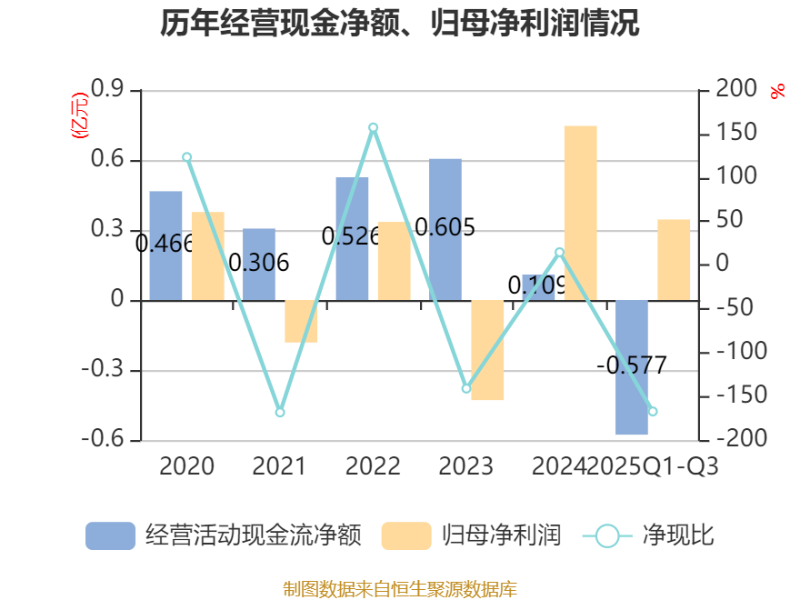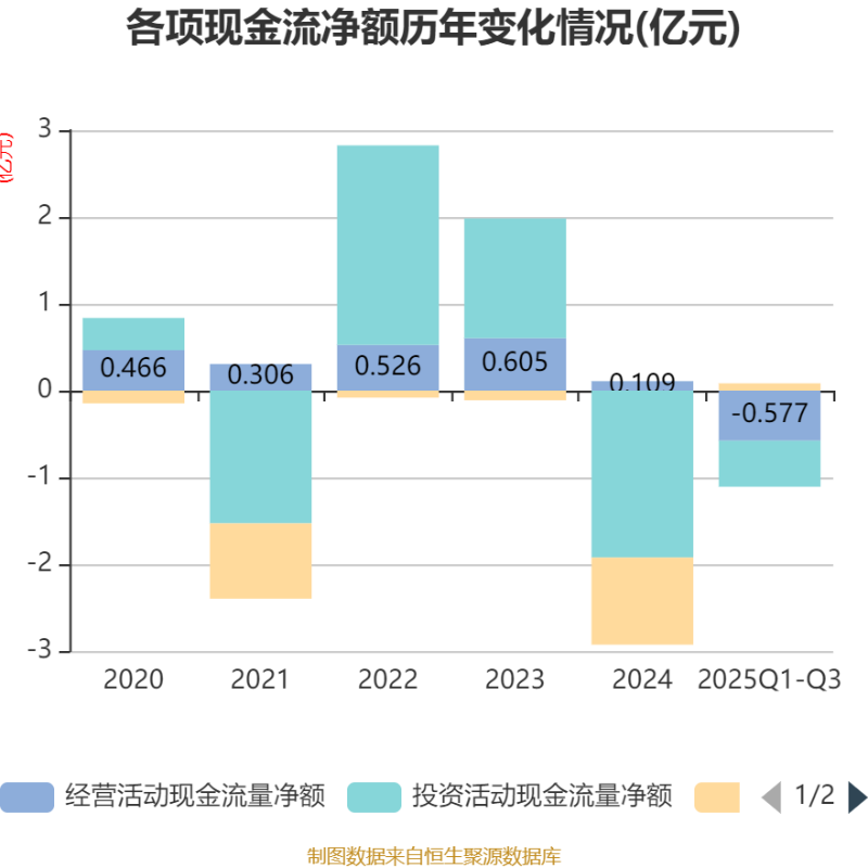 2025年前三季度,公司经营活动现金流净额为-5772.13万元,同比减少5696.26万元;筹资活动现金流净额837.18万元,同比增加1.24亿元;投资活动现金流净额-5310.38万元,上年同期为-2.46亿元。