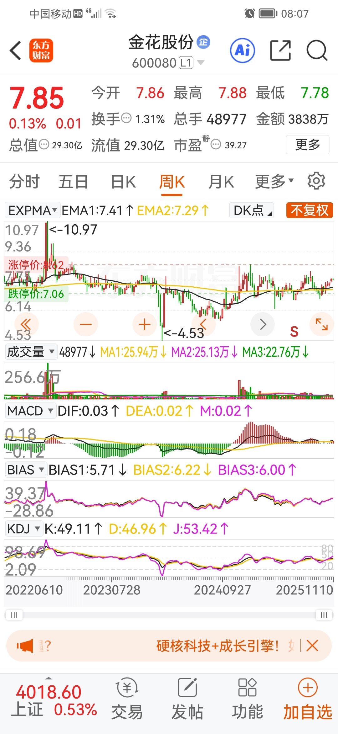 $金花股份(SH600080)$ #强势机会# #复盘记录# 周K线,底背离,MACD过零轴,早晚都会拉升的!