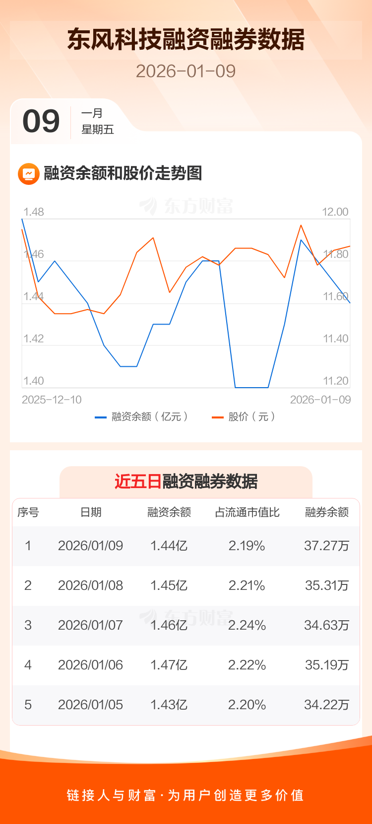 交易所最新数据显示,东风科技于2026年1月9日获融资买入416.31万元,融资偿还576.21万元,当日融资净偿还159.9万元。目前,该股融资余额1.44亿,占流通市值比例为2.19%。