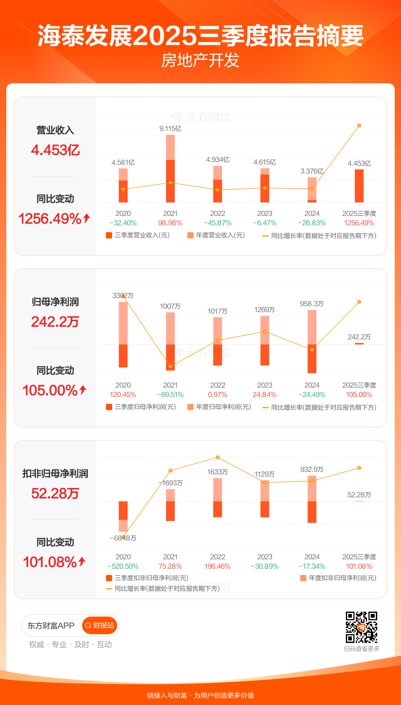 海泰发展10月31日发布2025年三季报显示,公司前三季实现营业收入4.45亿元,同比增长1256.49%;归母净利润242.20万元,同比增长105.00%;扣非归母净利润52.28万元,同比增长101.08%。