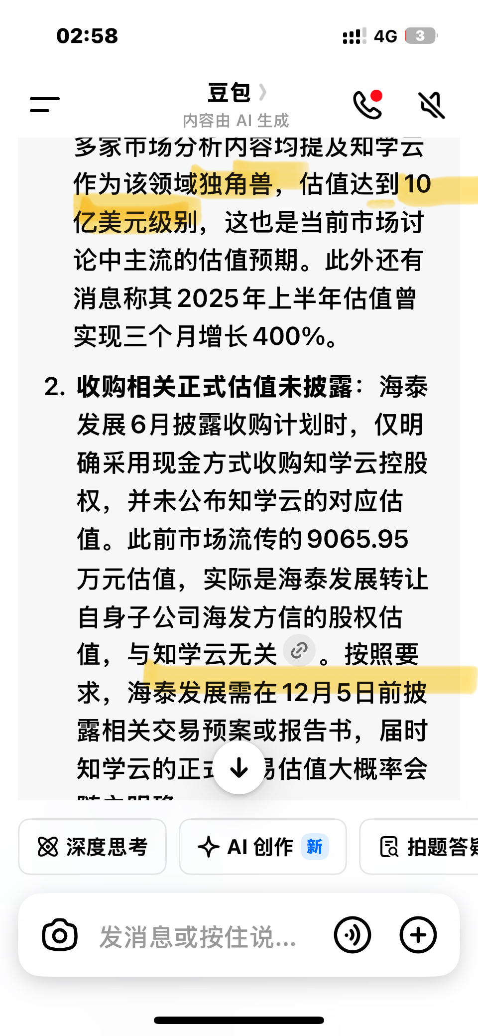 海泰发展 收购的知学云 估值 10亿美元也就是70亿人民币,还有根据公告 12月5日之前必须出公告! 也是今天周四晚上 必须公告!最后上车机会! 妥妥的翻倍股!错过再等一年! 可以自己去问豆包!