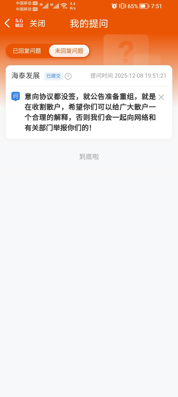 $海泰发展(SH600082)$ 虽然没剩多少股了,但是还是觉得有点气愤,妥妥的欺骗广大散户,这次不举报他们,估计下次还会玩“假重组”,这是海泰发展第二次玩“假重组”了吧