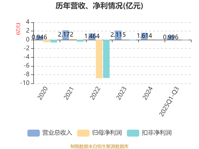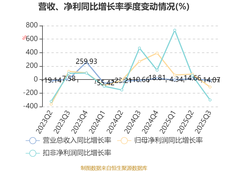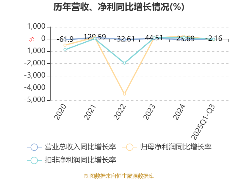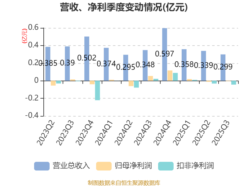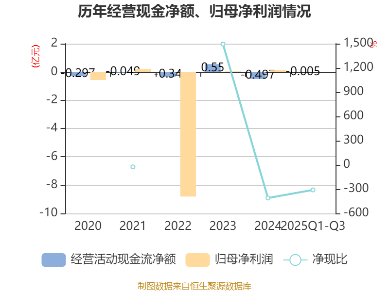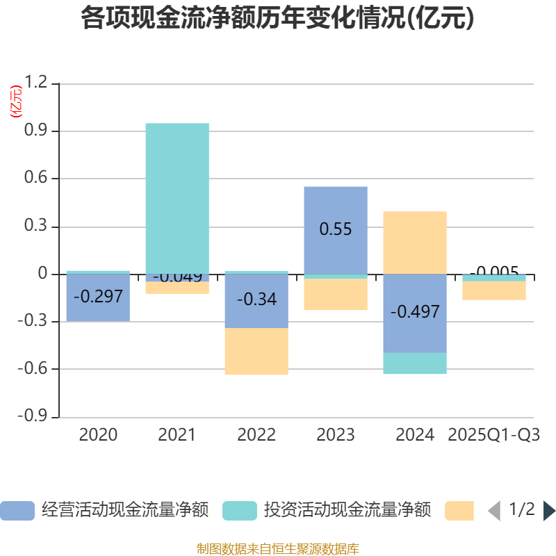2025年前三季度,公司经营活动现金流净额为-46.26万元,同比增加4579.38万元;筹资活动现金流净额-1170.99万元,同比减少1170.99万元;投资活动现金流净额-414.27万元,上年同期为-274.22万元。