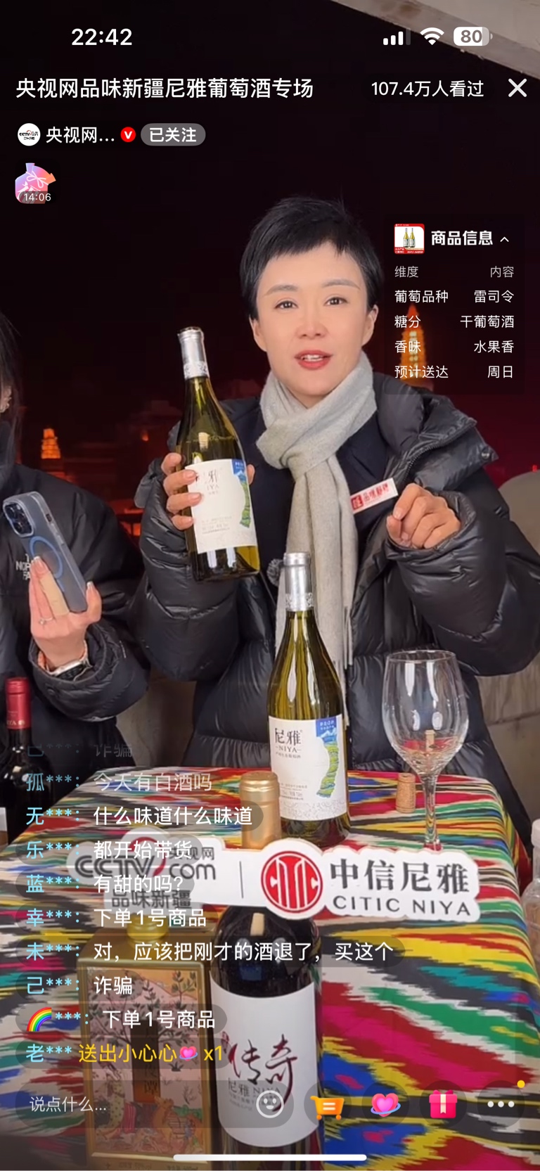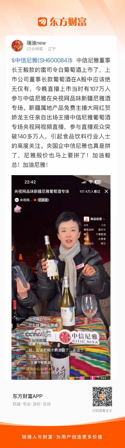 $中信尼雅(SH600084)$ 中信尼雅董事长王毅款的雷司令白葡萄酒上市了,上市公司董事长款葡萄酒在A股中应该绝无仅有,今晚直播上市当时有107万人参与中信尼雅在央视网品味新疆尼雅酒专场。新疆属地产品免费主播大网红贺娇龙主任亲自出场主播中信尼雅葡萄酒专场央视网视频直播,参与直播观众突破140多万人,引起食品饮料行业人士的高度关注。央国企中信尼雅也真是拼了,尼雅股价也马上要拼了!加油毅总!加油尼雅!