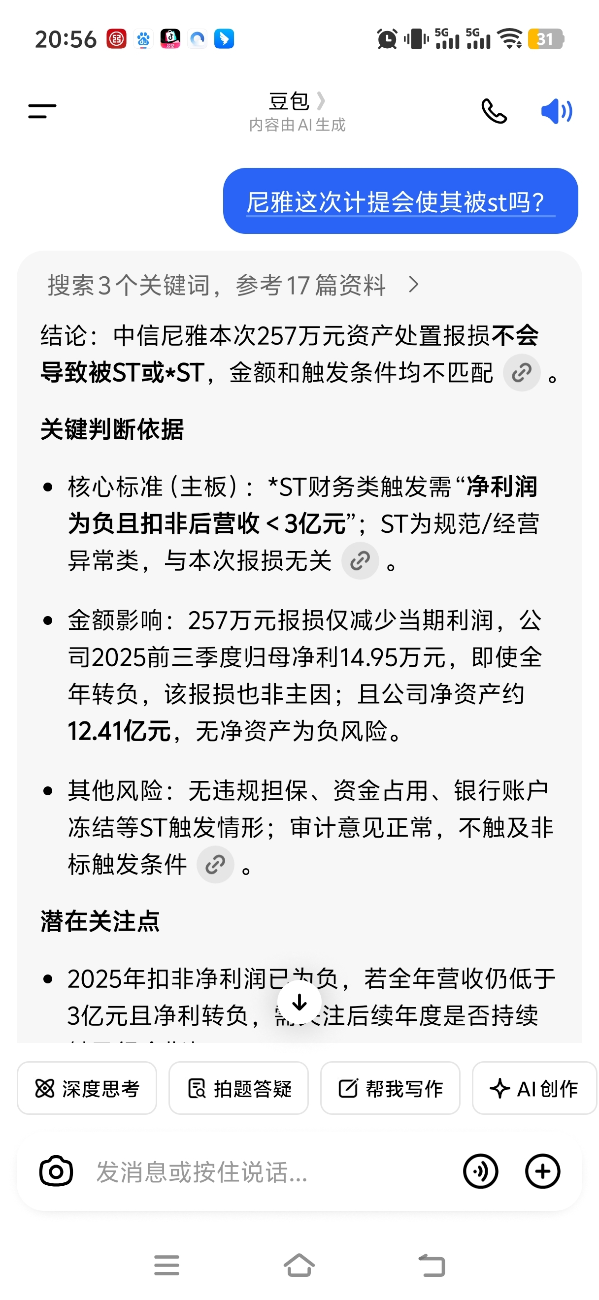 `这次计提会使尼雅st吗?问了一下豆包,放心了!