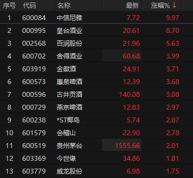上证报中国证券网讯 2月5日早盘,酒板块表现活跃,截至10时15分,中信尼雅涨停,皇台酒业涨近9%,百润股份涨超5%,舍得酒业、金徽酒、惠泉啤酒等跟涨。