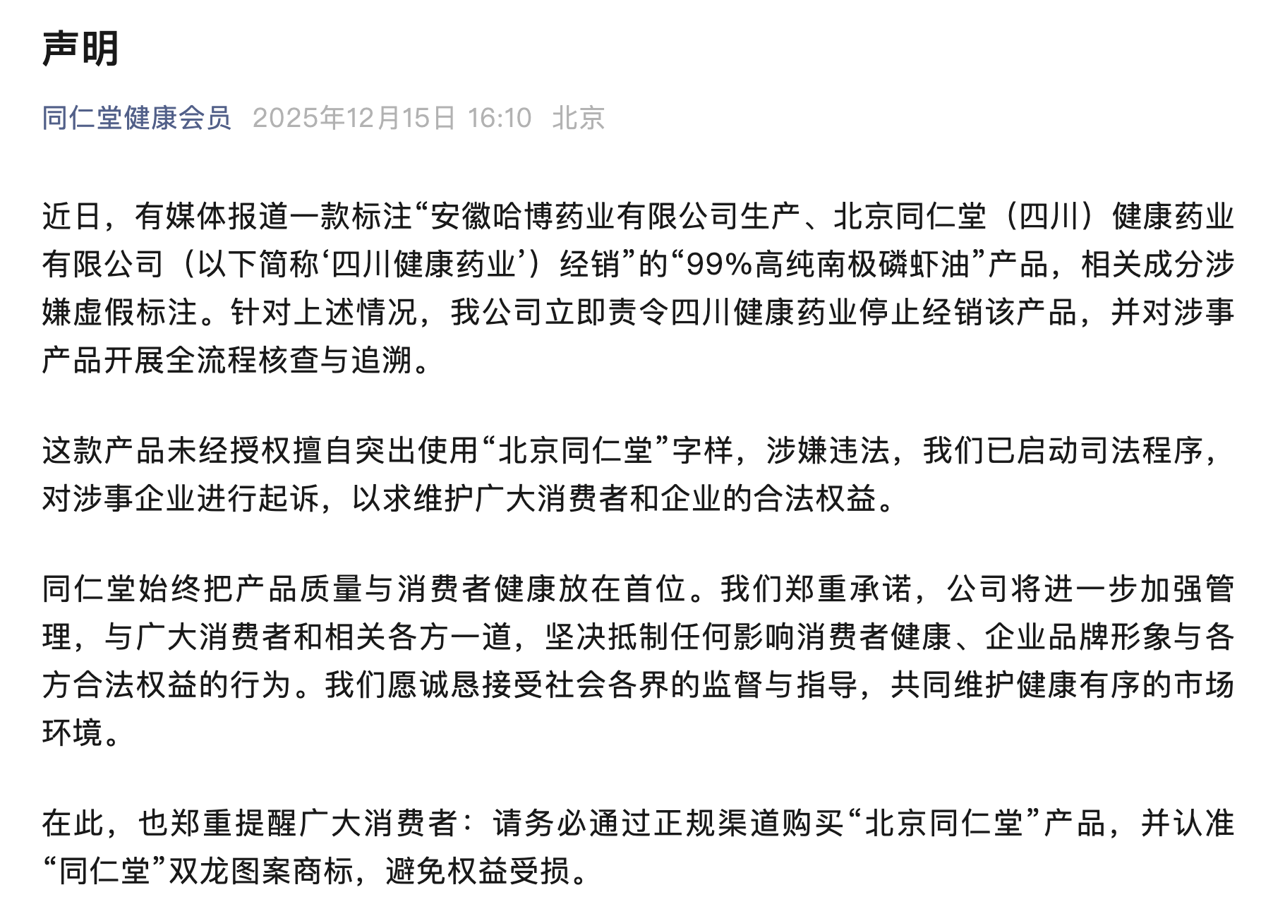 12月15日,“同仁堂健康会员”微信公众号发布声明称,有媒体报道一款标注“安徽哈博药业有限公司生产、北京同仁堂(四川)健康药业有限公司(以下简称‘四川健康药业’)经销”的“99%高纯南极磷虾油”产品,相关成分涉嫌虚假标注。针对上述情况,公司立即责令四川健康药业停止经销该产品,并对涉事产品开展全流程核查与追溯。同仁堂在声明中表示,这款产品未经授权擅自突出使用“北京同仁堂”字样,涉嫌违法,公司已启动司法程序,对涉事企业进行起诉。