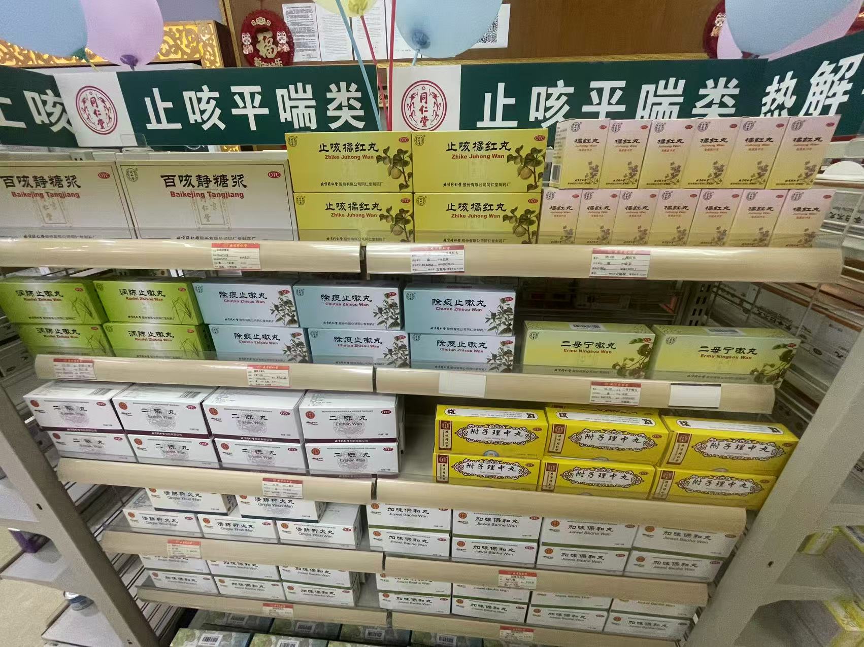 北京同仁堂深圳景田店柜台摆放同仁堂双龙商标的中成药。周良成/摄
