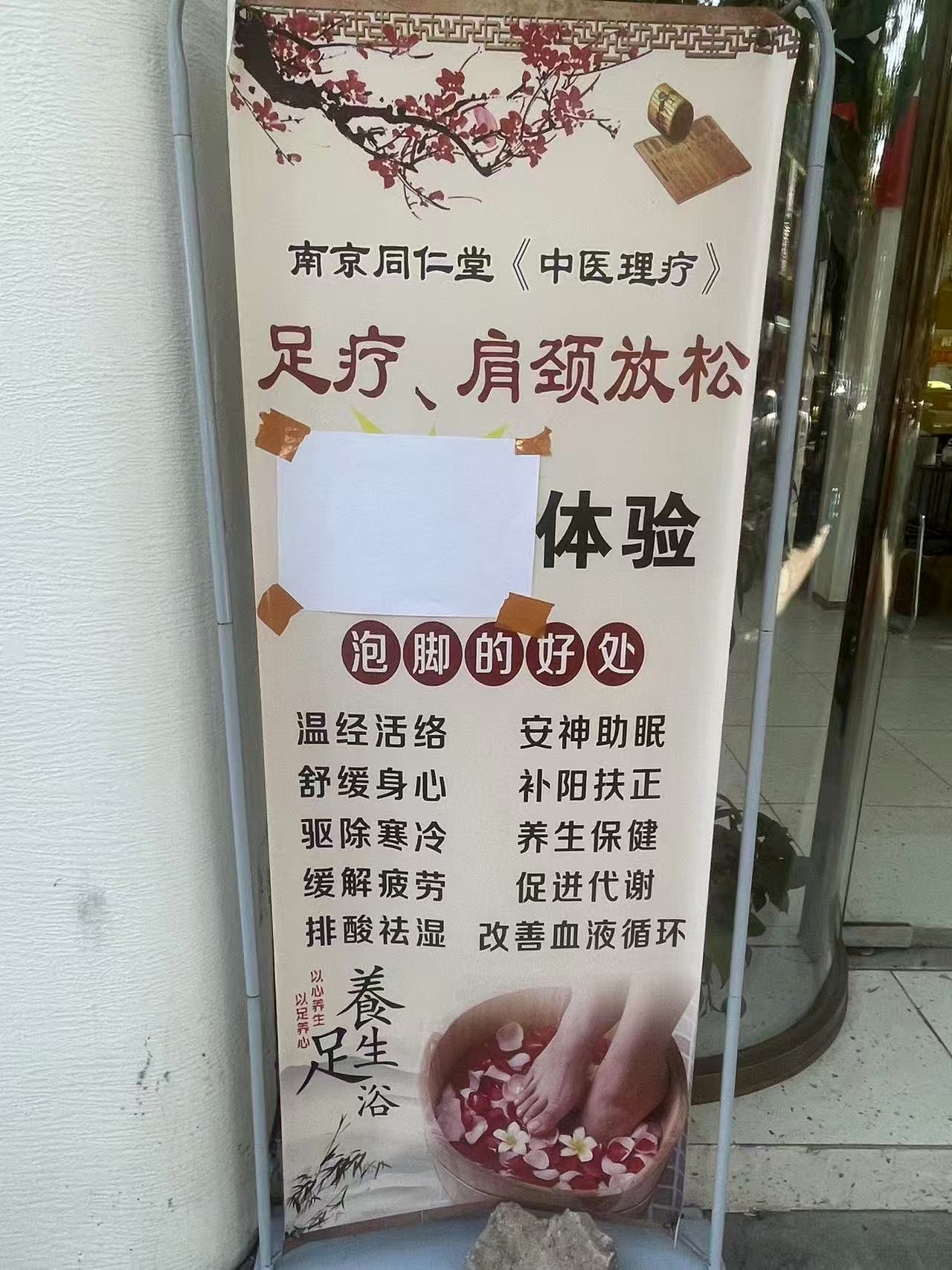南京同仁堂药王灸西丽店广告,以养生足浴为主。周良成/摄