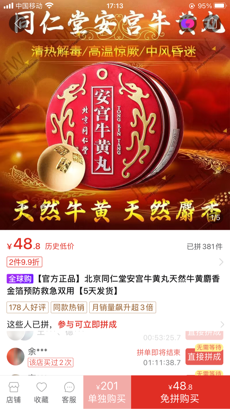 拼多多上的北京同仁堂安宫牛黄丸全球购48.8一盒是真的吗