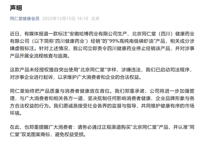 事件发酵后,北京同仁堂集团紧急致歉并启动内部清查,成都市场监管部门成立联合调查组进驻企业。这场由“零含量”产品引爆的信任危机,拷问着老字号品牌的授权管理体系,也暴露出南极磷虾油市场标准缺失、监管滞后等深层次问题。