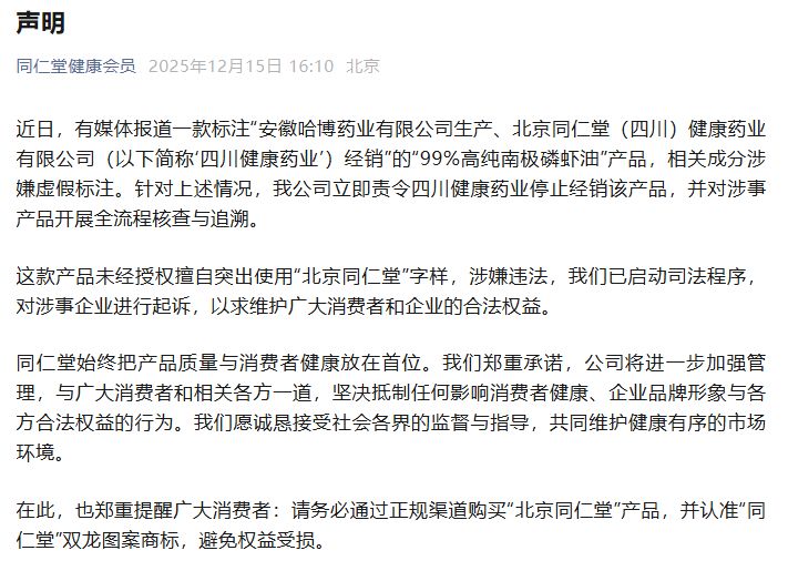 12月15日,北京同仁堂健康药业股份有限公司发布声明称,针对上述情况,公司立即责令四川健康药业停止经销该产品,并对涉事产品开展全流程核查与追溯。这款产品未经授权擅自突出使用“北京同仁堂”字样,涉嫌违法,公司已启动司法程序,对涉事企业进行起诉。